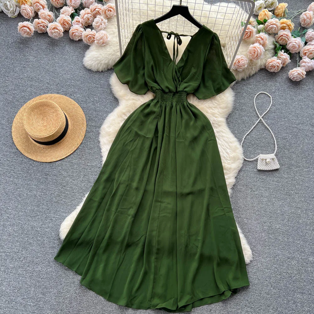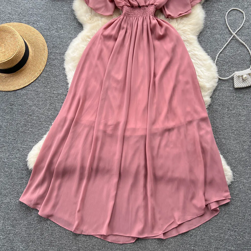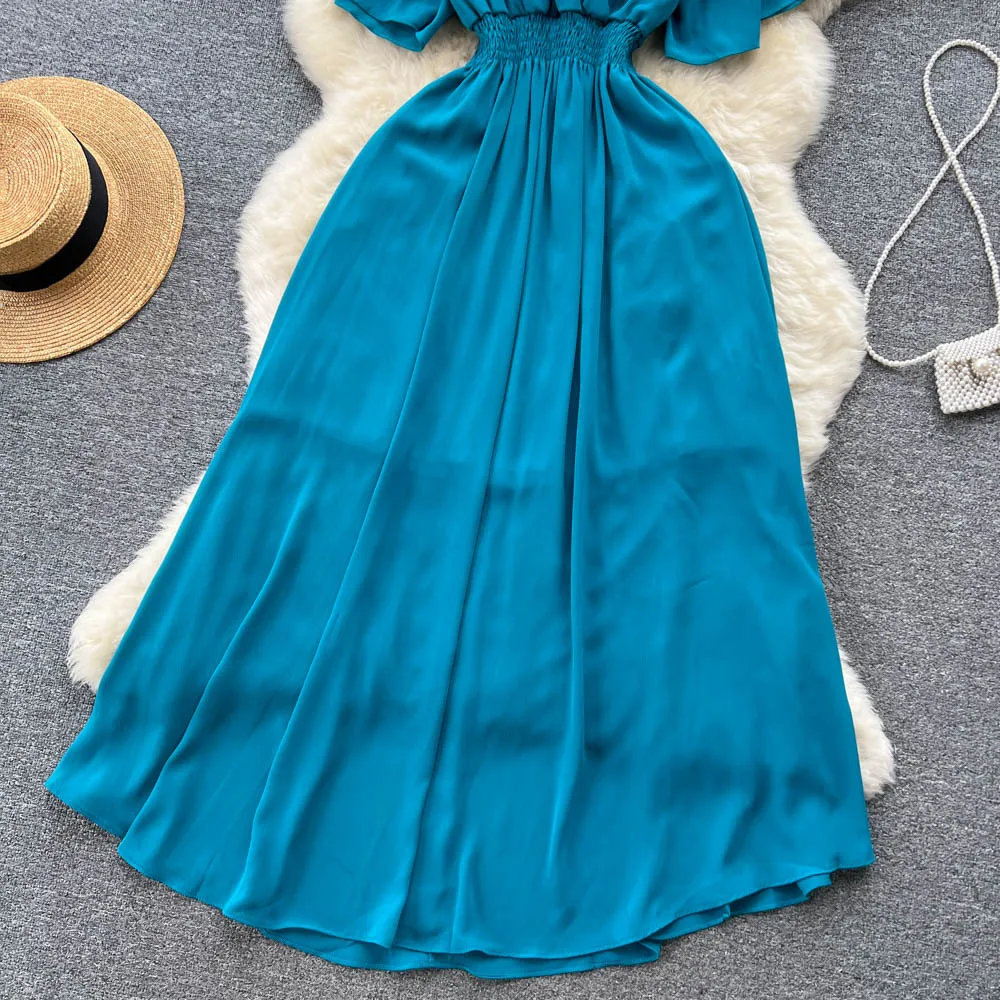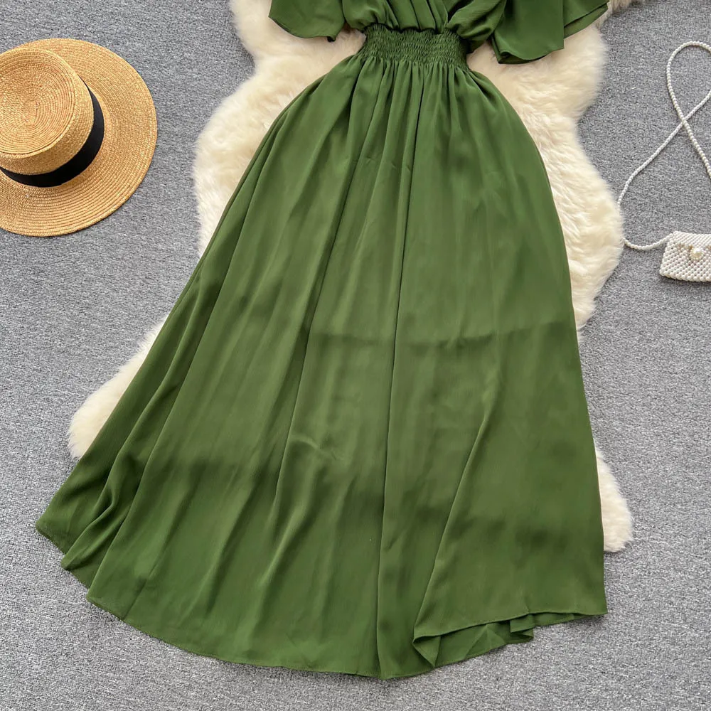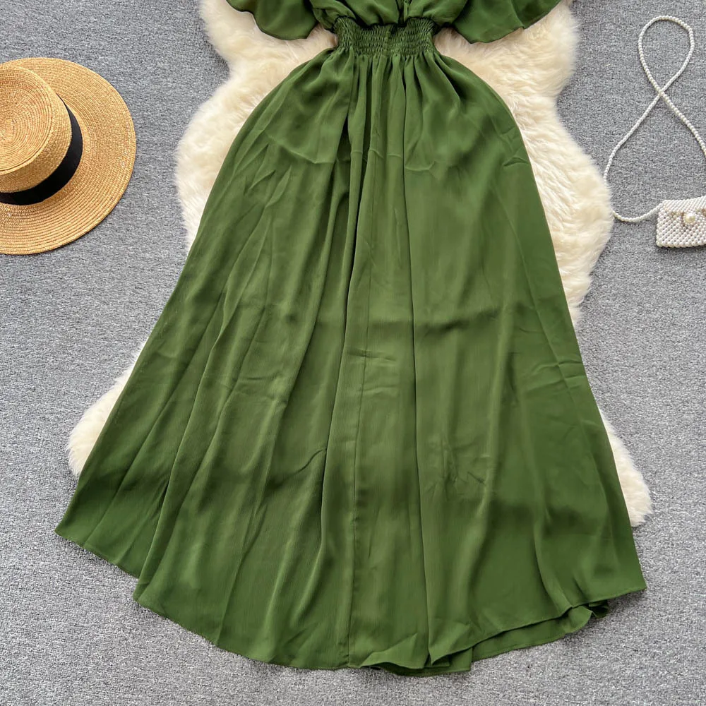 Chiffon Dress New Women's Graceful Collar Elastic Waist-Tightening Slimming Long Seaside Vacation Beach Premium Casual Dress