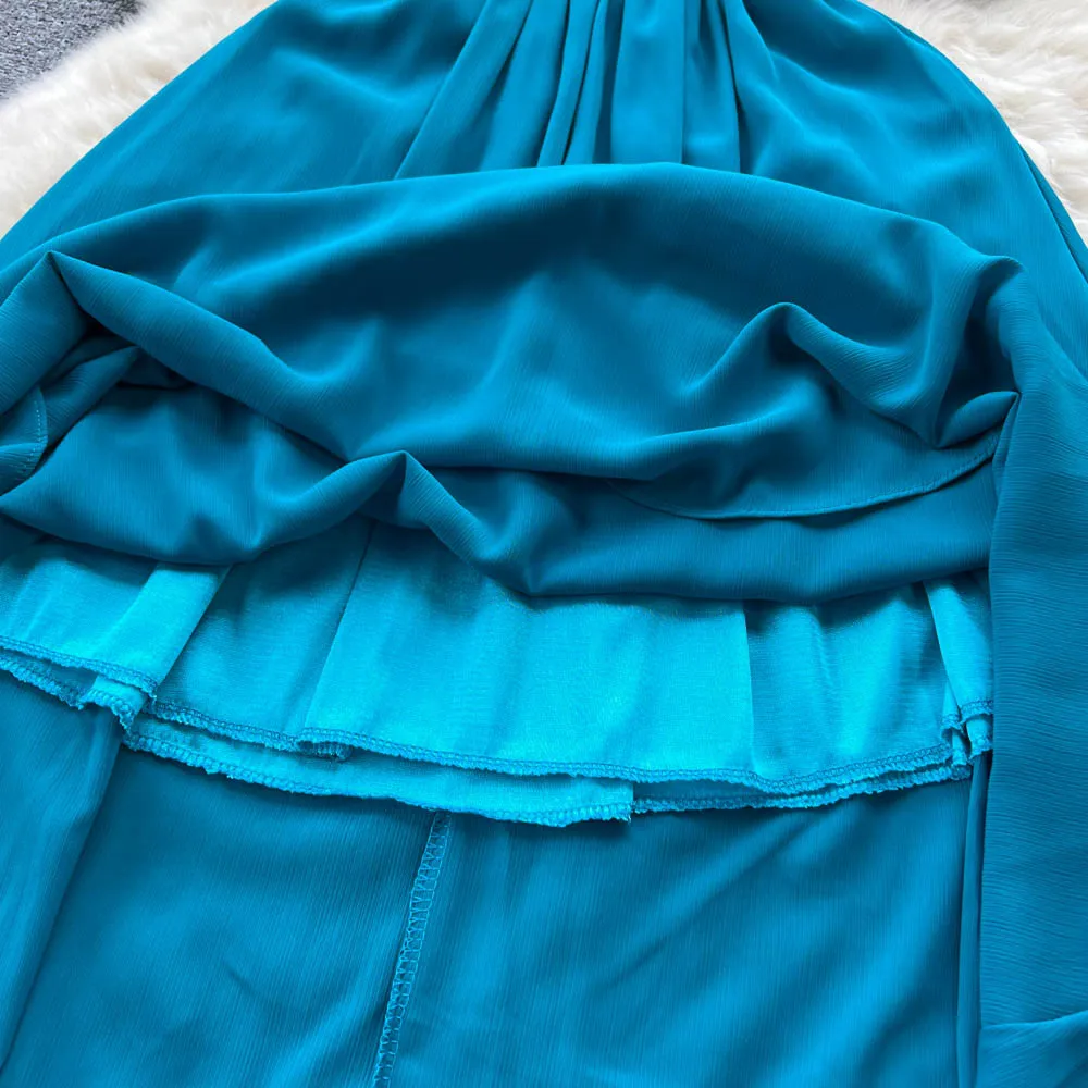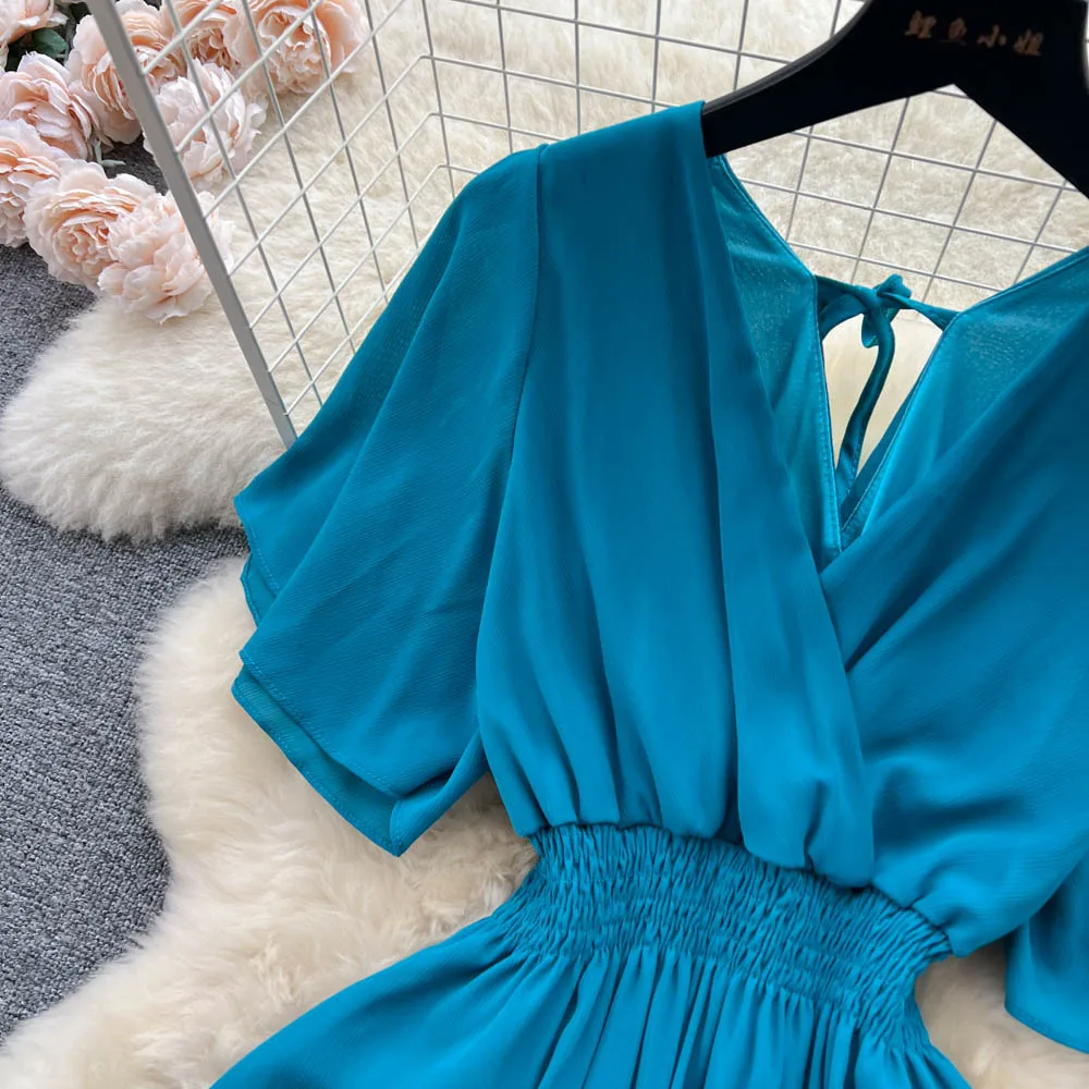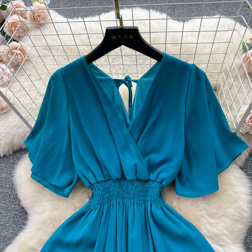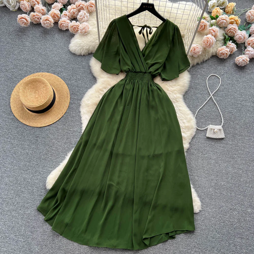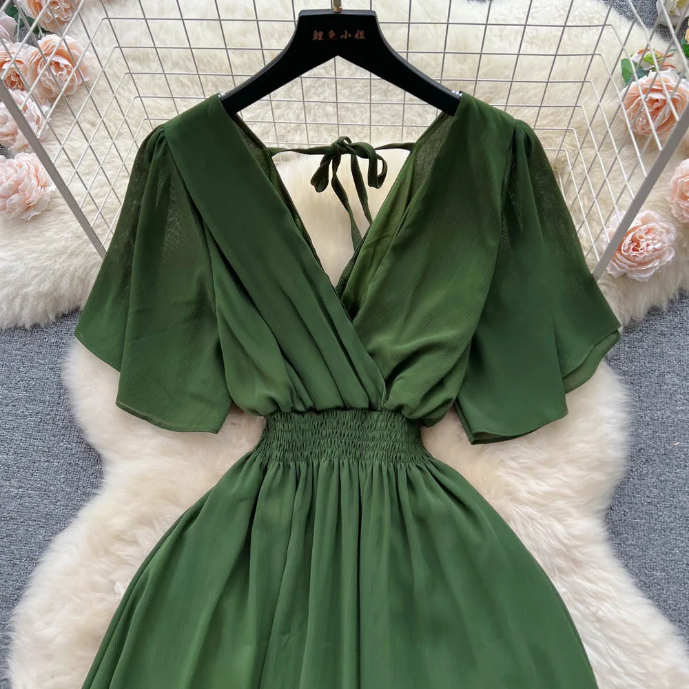 Chiffon Dress New Women's Graceful Collar Elastic Waist-Tightening Slimming Long Seaside Vacation Beach Premium Casual Dress