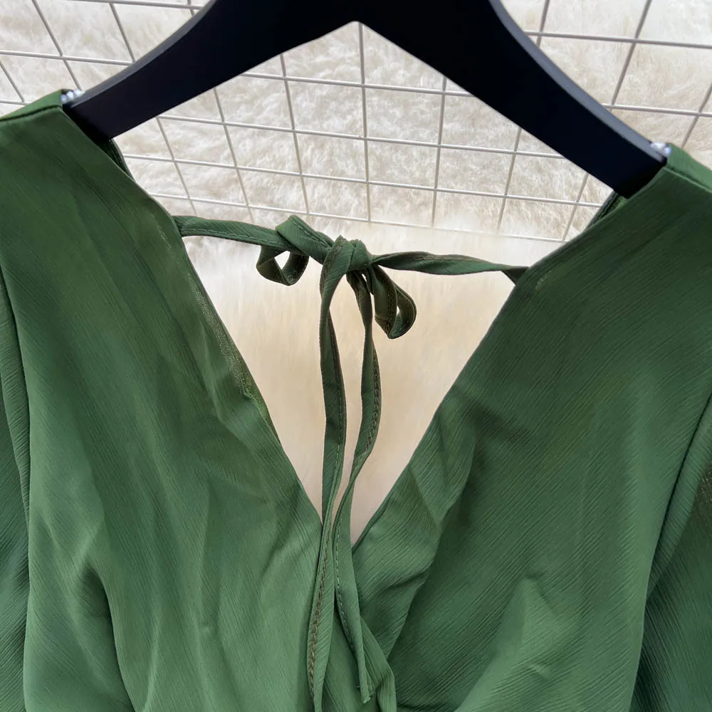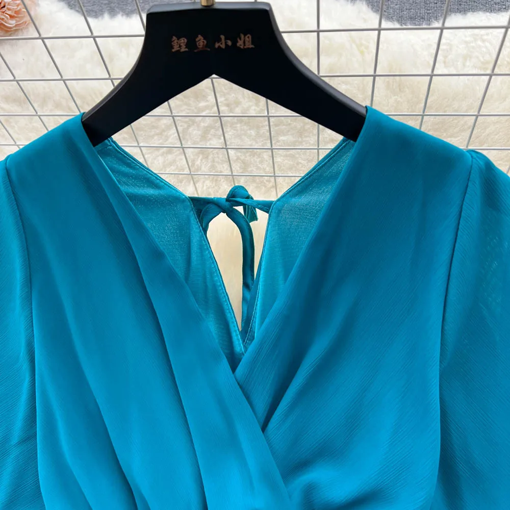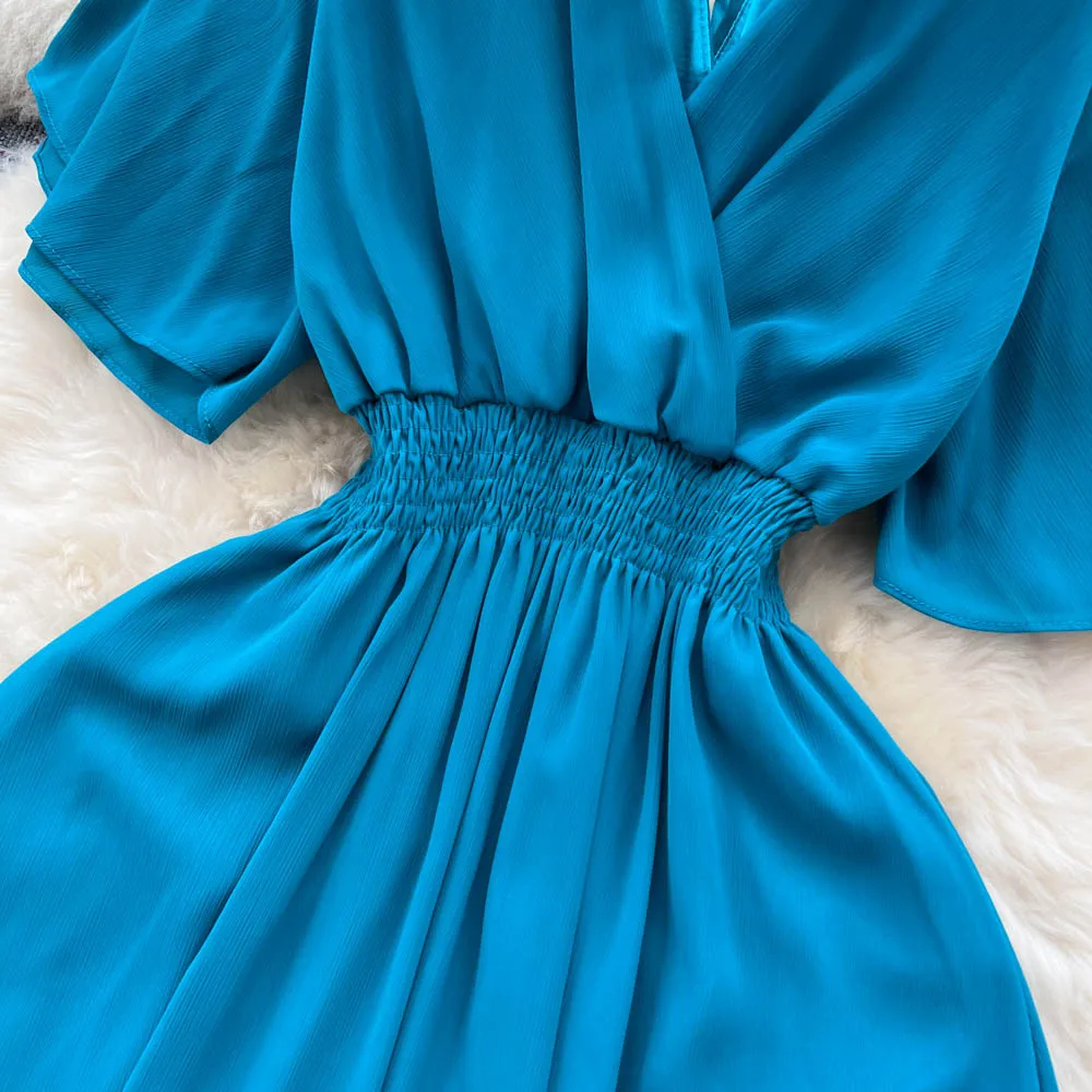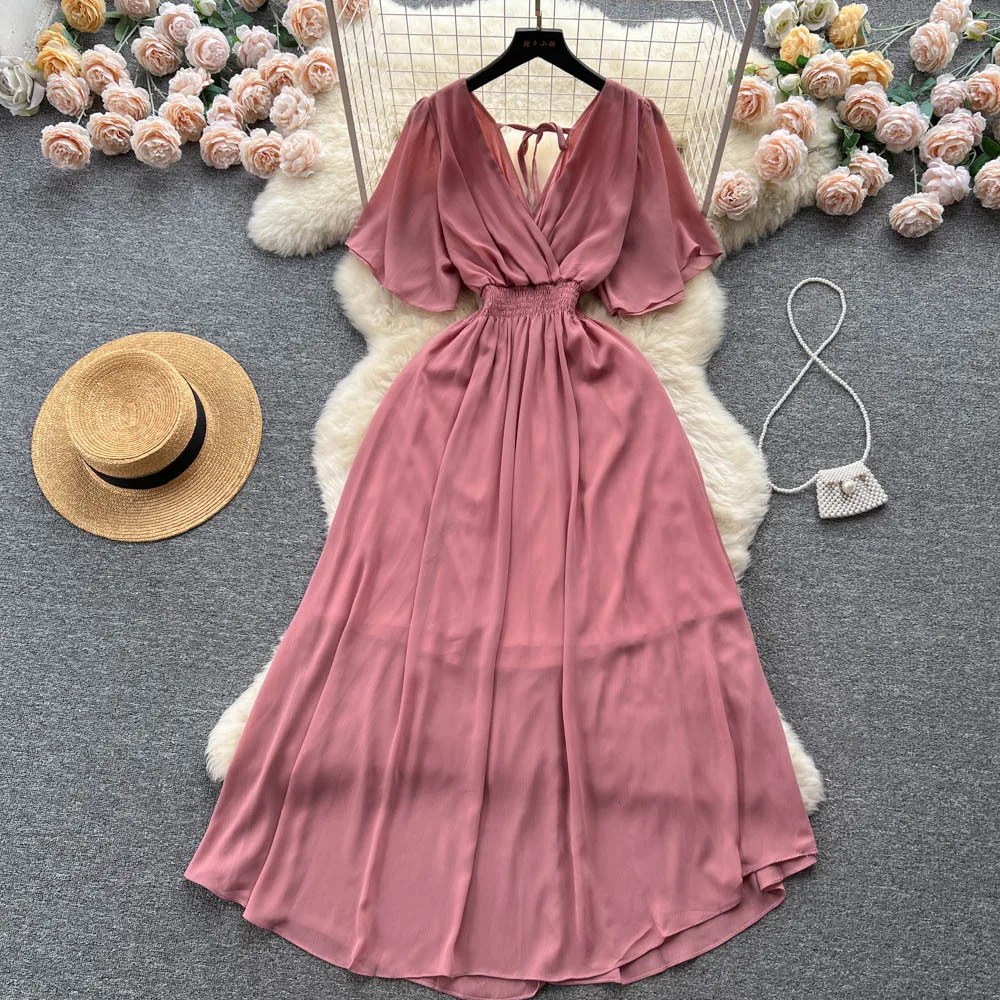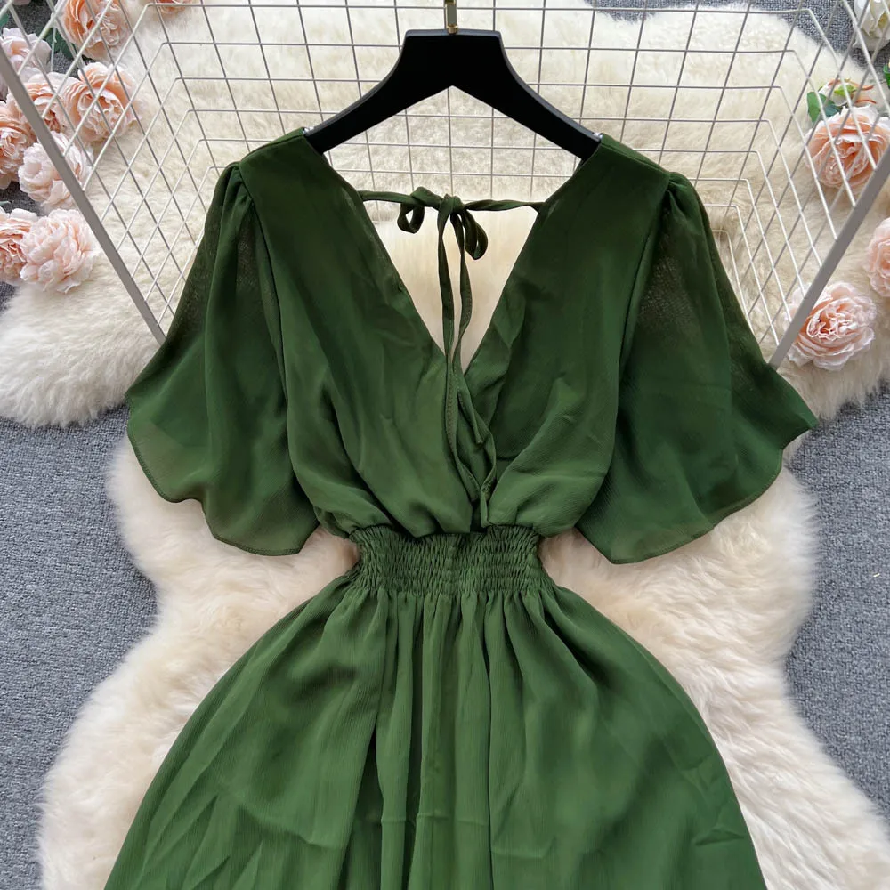 Chiffon Dress New Women's Graceful Collar Elastic Waist-Tightening Slimming Long Seaside Vacation Beach Premium Casual Dress