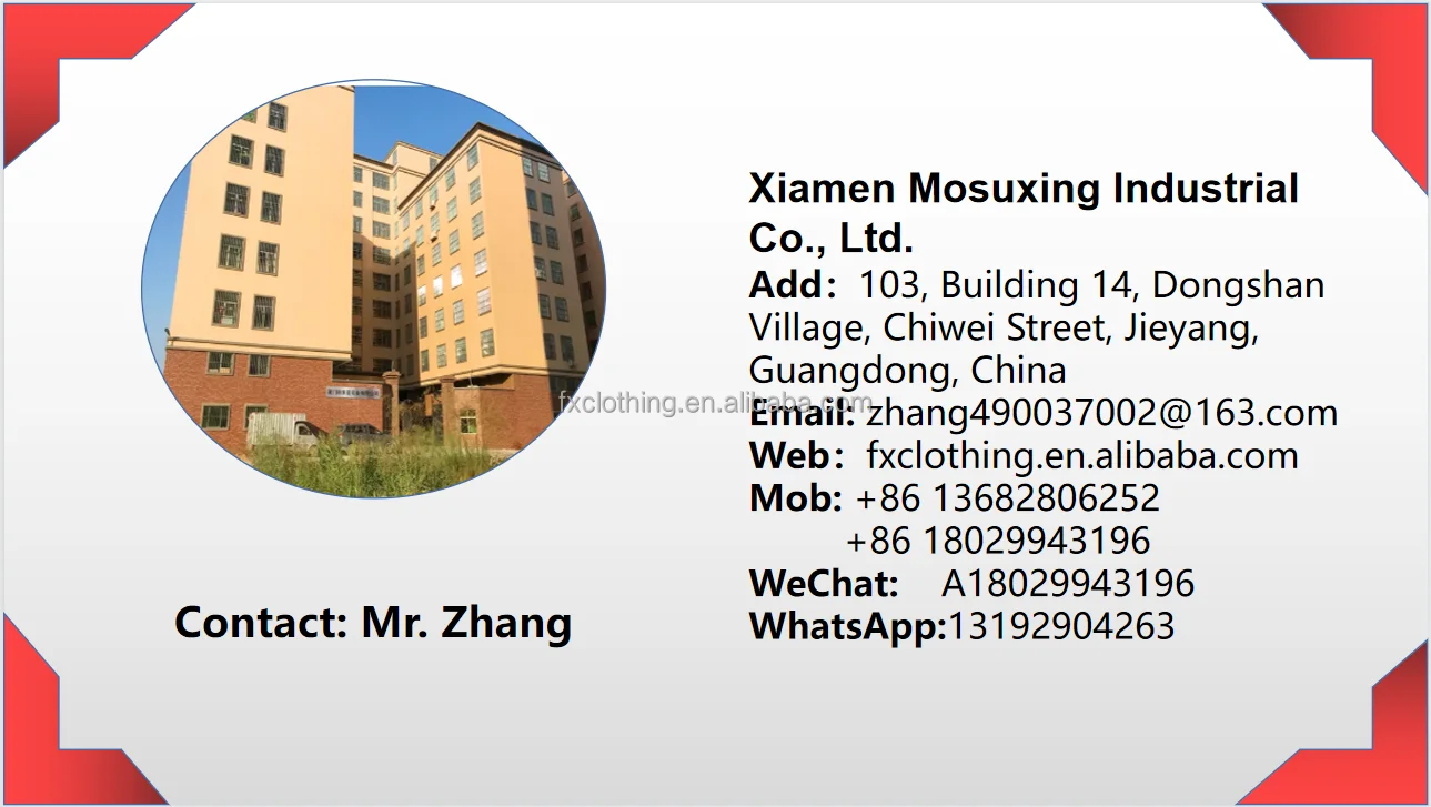 Xiamen Mosuxing Industry Co., Ltd. is located in Xiamen City, Fujian Province. Since its establishment 10 years ago, we have been engaged in the women's clothing industry, relying on excellent technical equipment, advanced manufacturing technology and strict technology, innovative development concepts, and strict quality management. Professional staff and high-quality products enable us to develop rapidly. "Quality first, continuous innovation" is our eternal purpose. The pursuit of honesty and product service is our continuous and satisfactory business spirit; our goal is to provide all customers with high-quality products and the best service. If you are interested in any of our products or need more information, please feel free to contact us. The company has always insisted on cooperation
