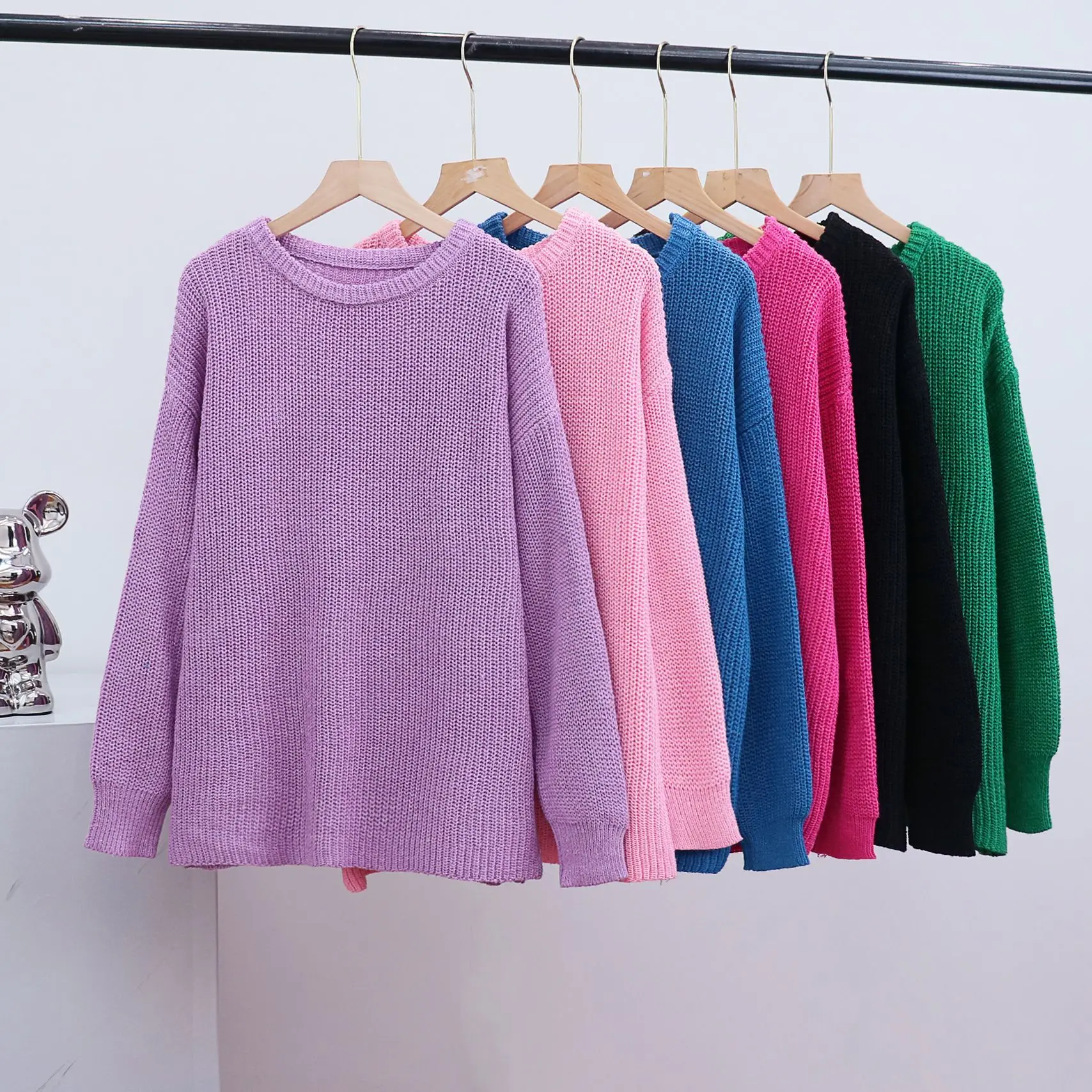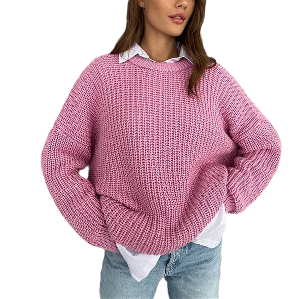Women 2024 Autumn Winter Loose Sweater Round Neck Solid Color All-Match Long Sleeve Breathable Lazy Pullover Tops Knit Sweater