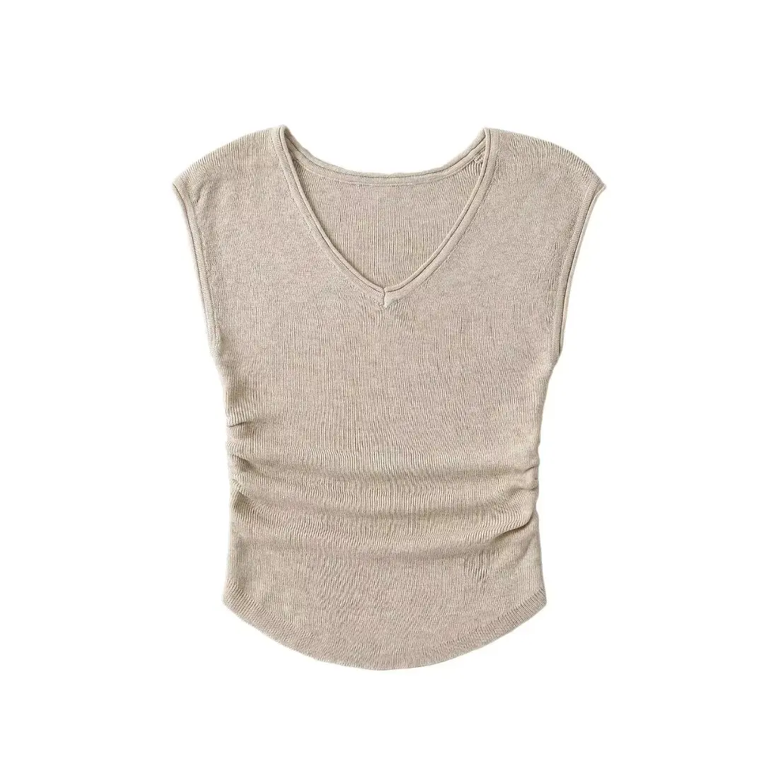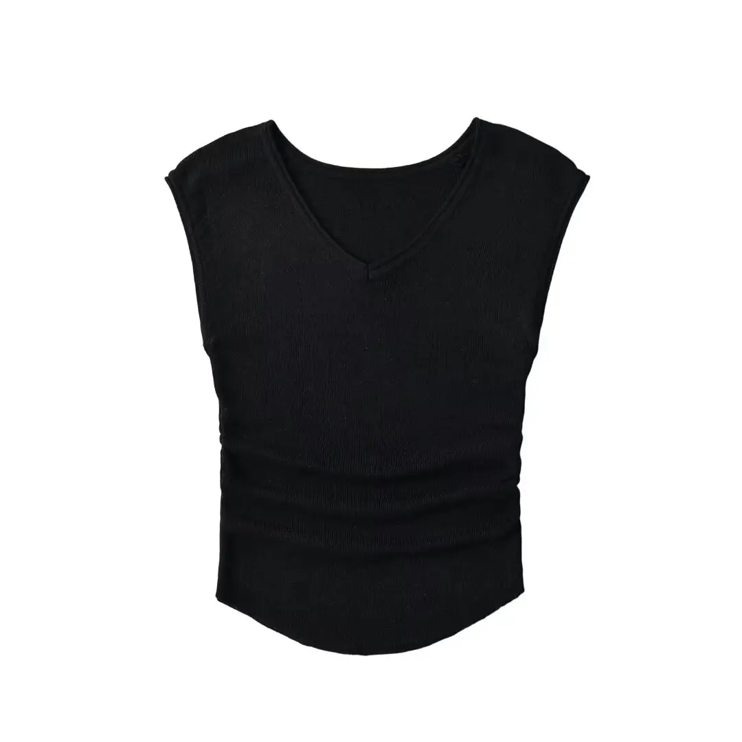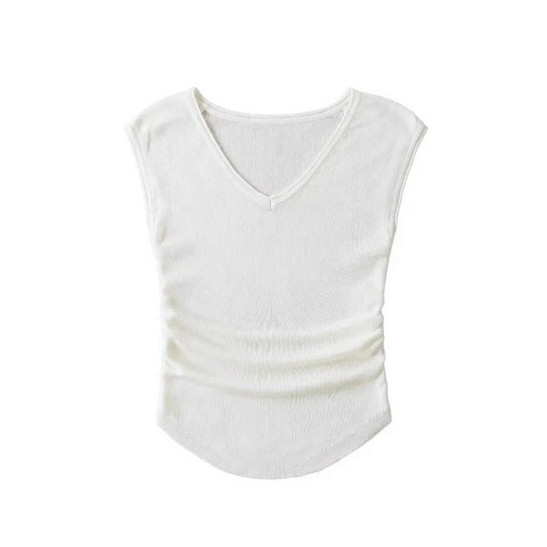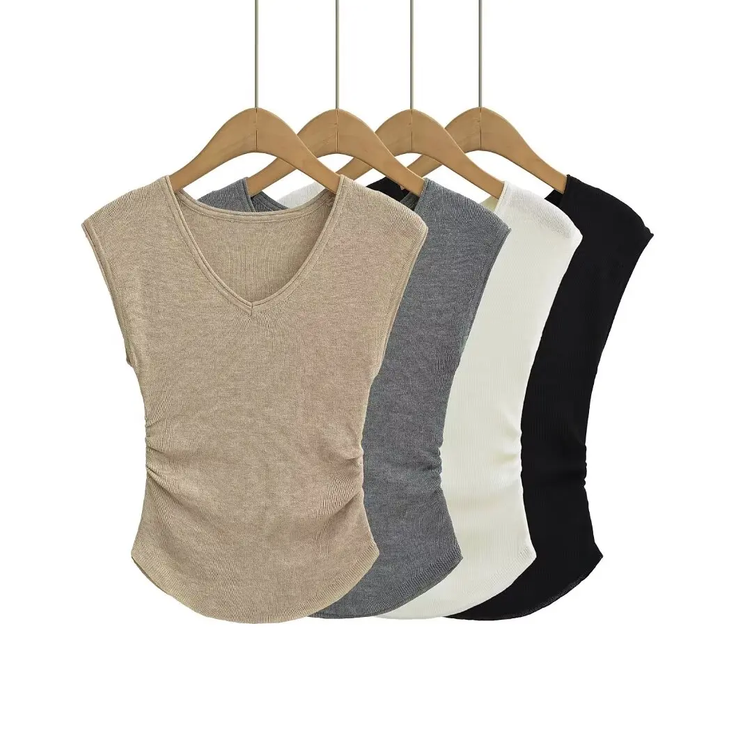 Women 2024 Summer New Fashion V-neck Knitted Waist T-shirt Vintage Casual Chic Female Tee Shirt Tops Mujer