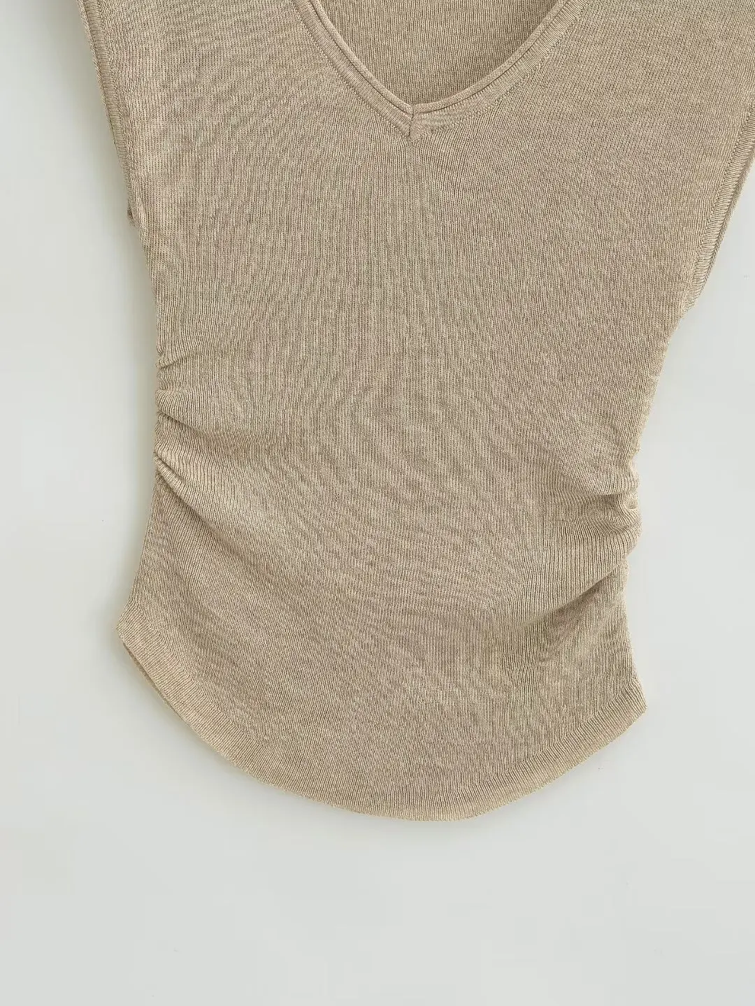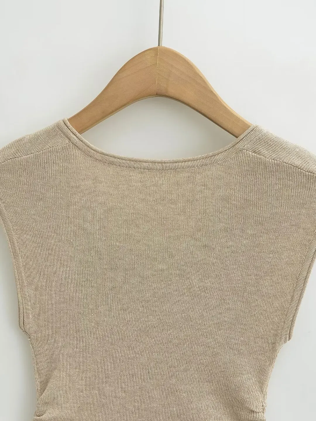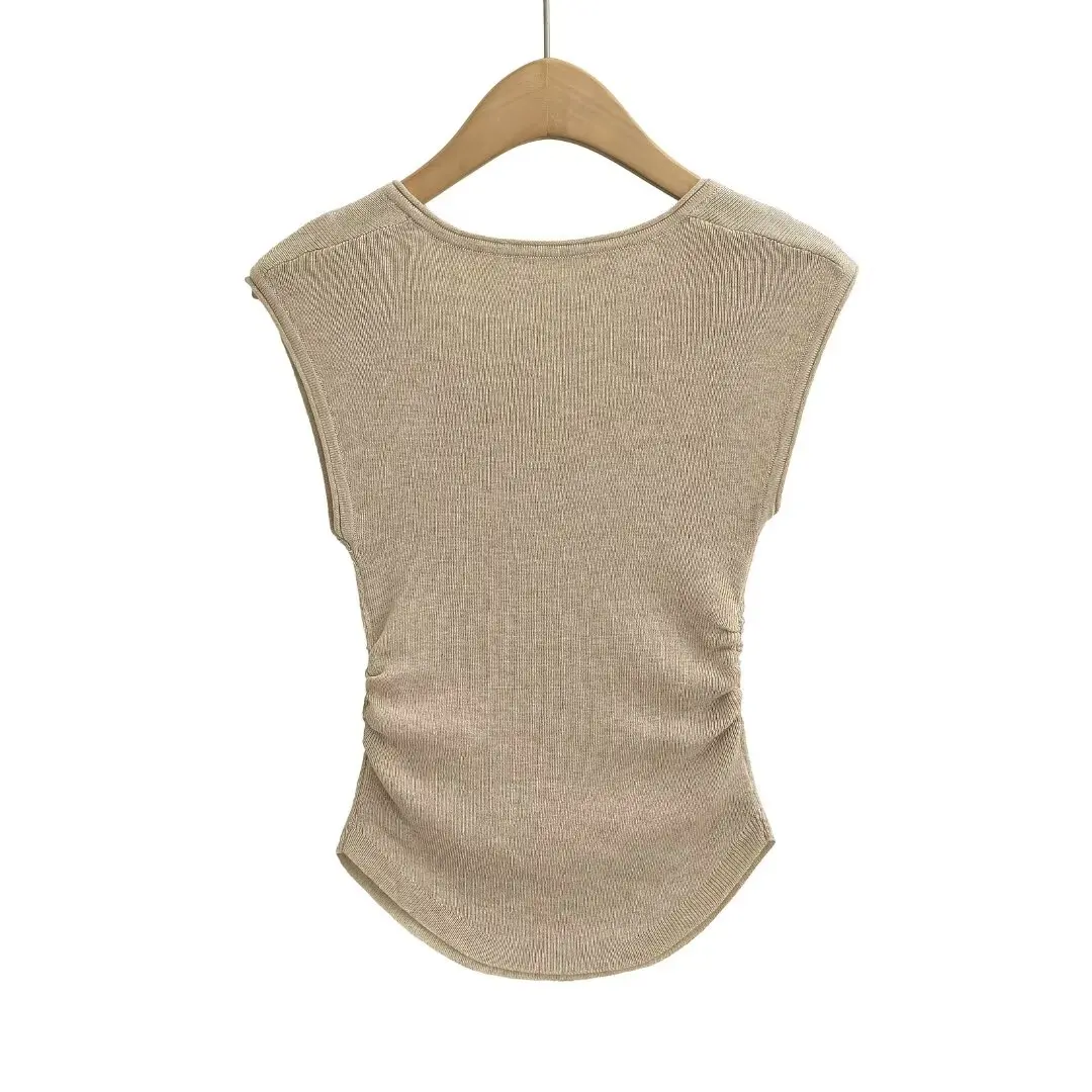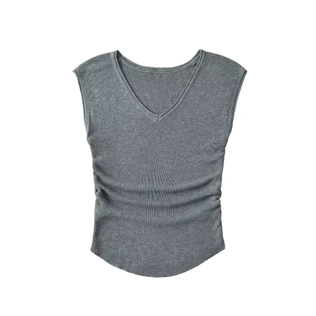 Women 2024 Summer New Fashion V-neck Knitted Waist T-shirt Vintage Casual Chic Female Tee Shirt Tops Mujer