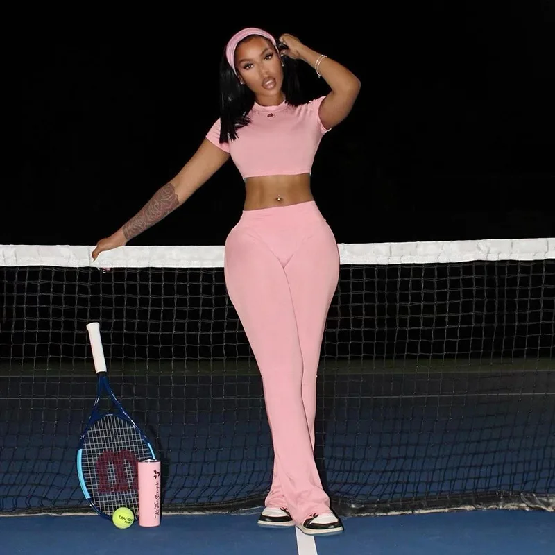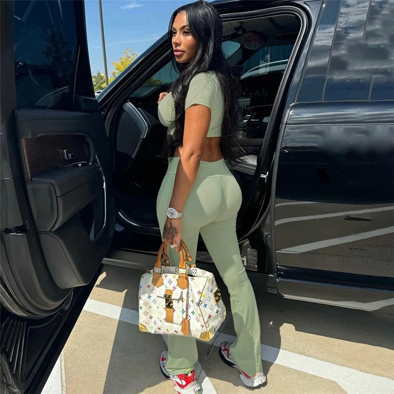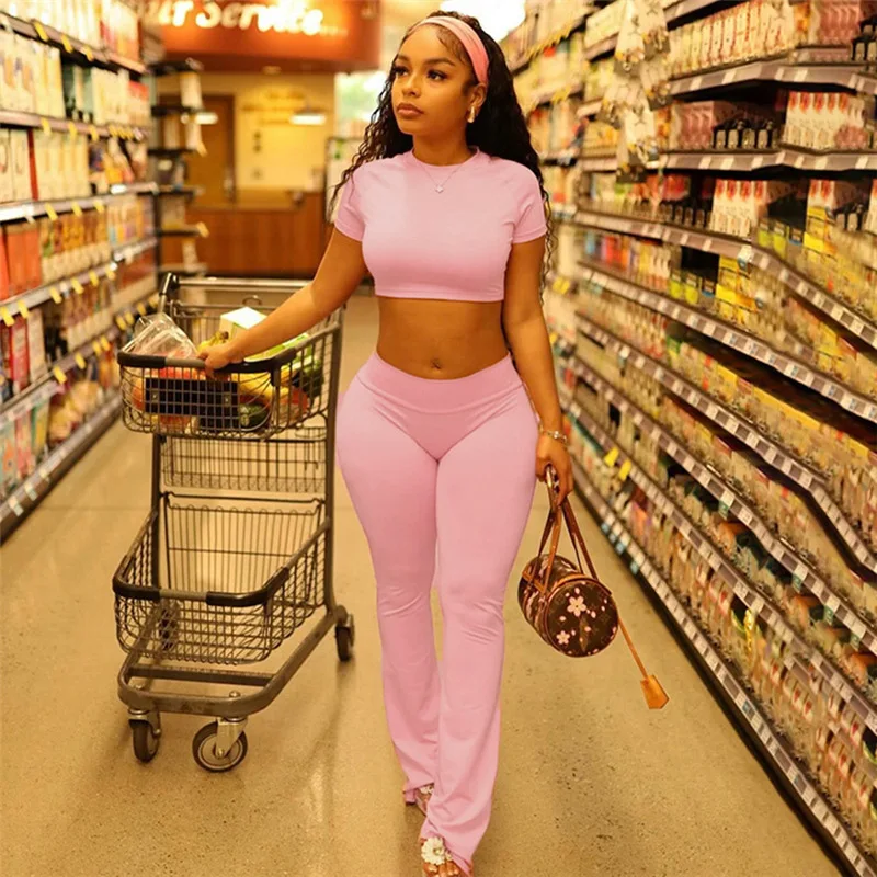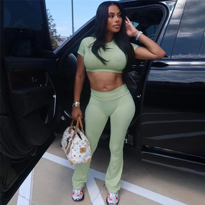 Women's 2 Piece Casual Outfits Short Sleeve Round Neck Tops Flare Leggings Sets Yoga Sweatsuit
