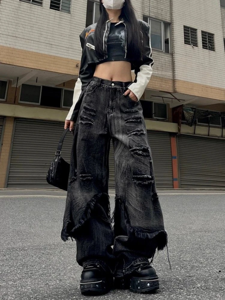Women's Hiphop Splicing Edge Design Unisex Jeans Cool Girl Streetwear High Waist Cowboy Trouser Casual Wide-leg Denim Pants